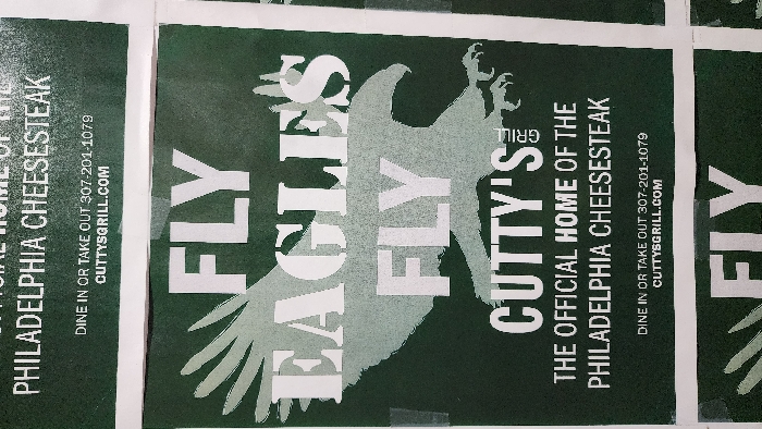 The image displays a series of identical, dark green promotional posters affixed vertically to a surface, likely a wall, with white gaps visible between them. The central and most prominent poster features the phrase "FLY EAGLES FLY" in large, white, stencil-style lettering, superimposed over a light gray silhouette of an eagle with outstretched wings and talons facing right. Below this, the text "CUTTY'S GRILL" appears in white, with "GRILL" rotated 90 degrees clockwise. Further down, the poster states "THE OFFICIAL HOME OF THE PHILADELPHIA CHEESESTEAK," followed by "DINE IN OR TAKE OUT 307-201-1079" and "CUTTYSGRILL.COM." Sections of white adhesive tape are visible along the vertical edges of the main poster, securing it to the surface. The repetition of the poster suggests a commercial advertising display, specifically for Cutty's Grill, located in Jackson, Wyoming, United States of America, indicated by the 307 area code in the contact number. No individuals are present.