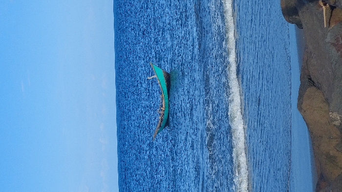 This image depicts an unidentified coastal location under a clear blue sky. A small, green and black-hulled wooden boat is centered in the mid-ground, floating on the deep blue water. The boat contains dark, indeterminate objects, possibly fishing gear. A white bird is perched on the bow of the boat, facing left. In the foreground, a white-capped wave breaks onto a shore characterized by dark brown and grey rocks. The water transitions from deep blue to a lighter shade near the shore, where a narrow strip of wet sand is visible between the rocks and the breaking wave. No human subjects are present.