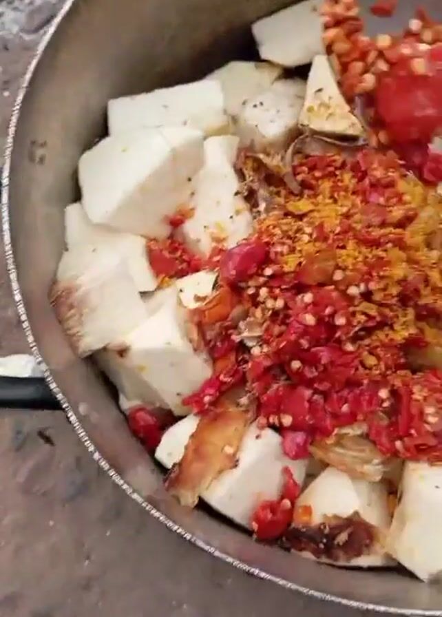 . The video shows a large metal pot filled with chunks of white yam. A person adds a mixture of red chilies and yellow spices to the pot using a metal spoon. The pot sits on the ground near a small fire. The ground is covered in dirt and ash.