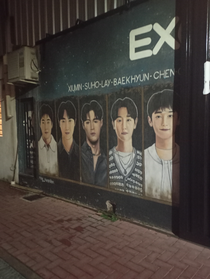 - "An exterior wall mural featuring five members of the K-pop group EXO is depicted at night in the Barrio Chino, specifically located at Arribeños 2260, Belgrano, Buenos Aires, Argentina" by FM-T7GLQ2, licensed under CC BY 4.0