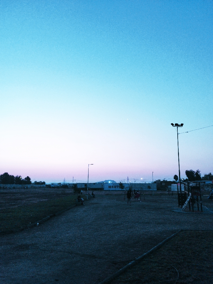 A dusk scene features a recreational field with sparse grass and a dirt path. In the distance, a low, white building with signage is visible under a sky gradient of blue, fading to light purple near the horizon. Silhouettes of people and trees are scattered across the field. Streetlights and a tall sports lighting pole punctuate the scene. A playground structure sits on the right.