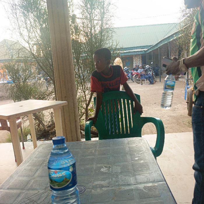 A young boy stands behind a green plastic chair. A table in the foreground displays a bottle of water labeled "Swan." Another table sits nearby, under a support column. In the background, people are seated on motorbikes outside a building with a green roof. A man stands partially in frame on the right, holding a water bottle and a phone. The lighting suggests it is daytime.