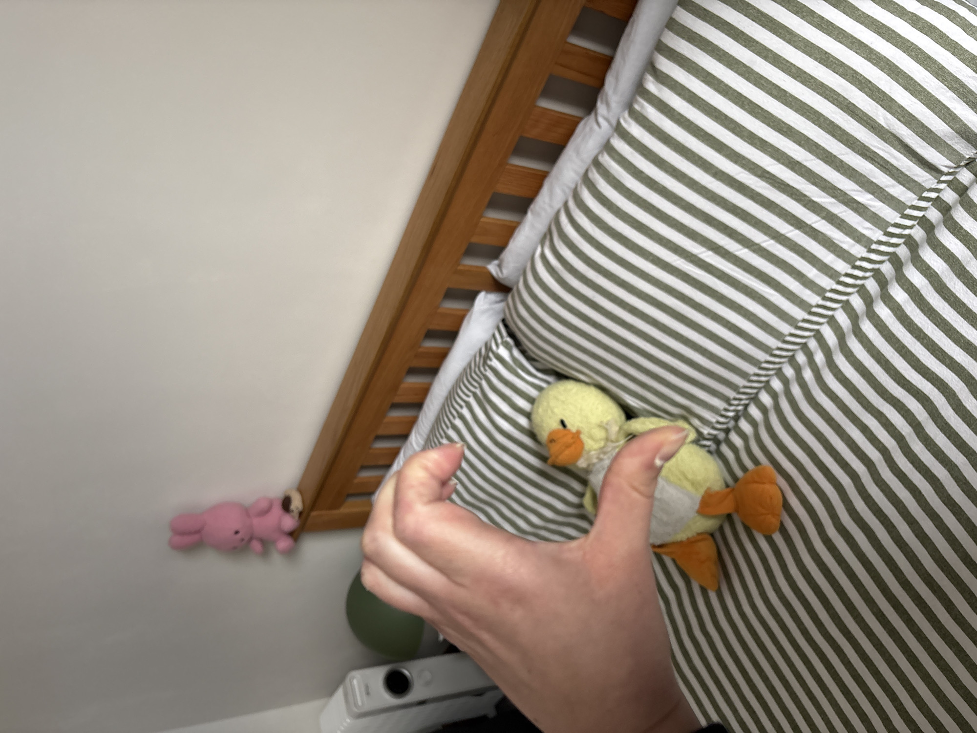 This image depicts an indoor bedroom scene. A light-skinned human hand, positioned in the foreground, forms a heart shape with its fingers around a yellow duck plush toy. The duck toy, featuring an orange beak and feet, rests on a bed covered with a duvet or blanket characterized by alternating green and white diagonal stripes. A wooden headboard with vertical slats is visible behind the bedding. To the left in the background, a white portable electric heater/radiator and a dark green spherical object are partially visible. On the top edge of the wooden headboard, a pink bunny plush toy stands next to a small, dark, possibly brown and cream-colored object. The wall behind the bed is plain and light-colored. There are no identifiable visual markers within the image to specify a location within the city of Manchester, United Kingdom.