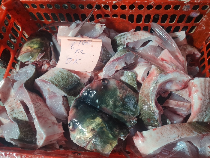 In the city of Qorowul, Uzbekistan, a red, perforated plastic crate is filled with freshly cut fish pieces. The crate contains a collection of irregular fish fillets, chunks of fish meat with skin and scales, and multiple fish heads. A prominent fish head, dark-scaled with a visible eye, is situated in the lower central part of the crate, alongside a partial head on the left exhibiting greenish-gold hues near the gill plate. The fish flesh appears light pink to white, interspersed with reddish areas indicative of blood. Various pieces retain portions of skin with scales, ranging in color from light grey to dark green, and several fin remnants, including a distinct dorsal fin, are visible. A light pink paper slip with handwritten text, "6.100", "кг.", and "ок.", is positioned amidst the fish, likely denoting weight or price information.