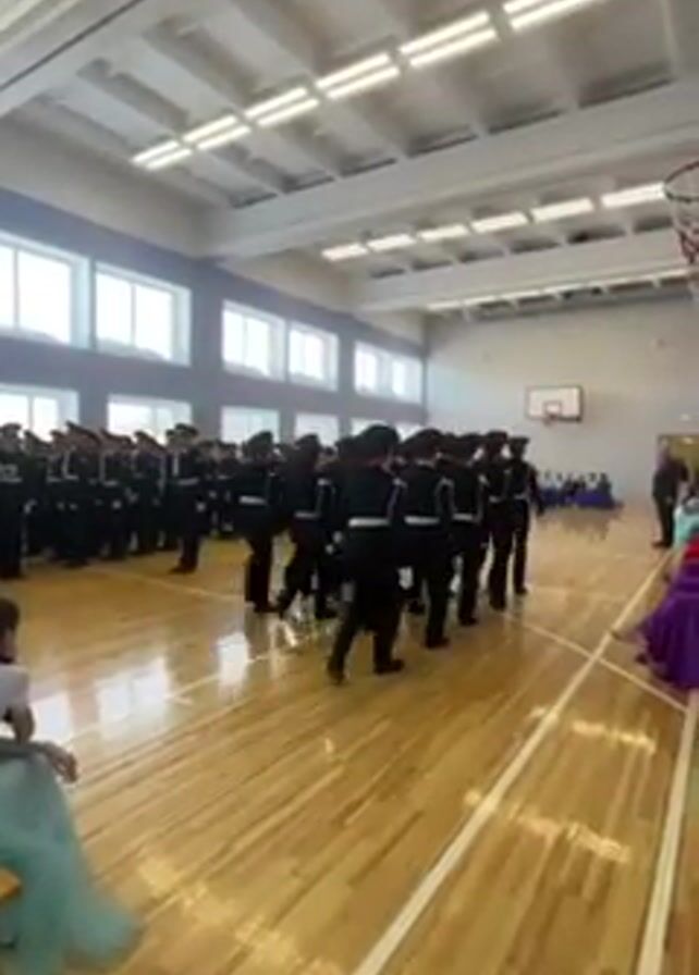 A gymnasium is shown in a video where a large group of men dressed in dark uniforms march on a shiny wooden floor in a close formation