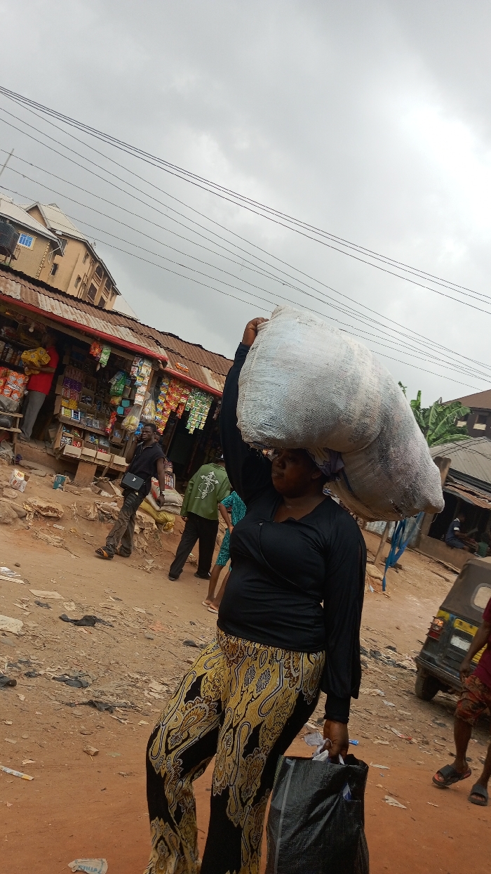 The image depicts an urban street scene in Onitsha, Nigeria, likely a commercial or market area, under an overcast sky. In the foreground, an adult female with a dark complexion walks from left to right. She wears a black long-sleeved top and black trousers with a prominent yellow and gold paisley pattern. A large, off-white, bulging sack is balanced on her head, supported by her raised left arm. Her right hand holds a black plastic bag down by her side. She is looking slightly downwards and to her right. The ground is an unpaved, reddish-brown dirt road, showing signs of wear and scattered refuse, including plastic bags and paper. Utility lines stretch horizontally across the upper portion of the frame. In the mid-ground, a row of single-story shops or stalls with corrugated metal roofs lines the left side of the road. The leftmost shop has an open front, displaying various packaged goods such as snacks, drinks, and household items. A person in a red shirt is partially visible near this shop's entrance. Further right, another male figure in a dark sleeveless top and dark pants, carrying a black shoulder bag, walks past these shops. Another individual wearing a green long-sleeved shirt with white graphics is seen walking away from the camera. Behind the initial row of shops, a taller, multi-story light brown building with multiple windows is visible. Towards the far right mid-ground, part of a dark-colored tricycle (keke napep) is visible, with a person sitting or squatting near it. Green foliage is present behind some of the structures on the right.