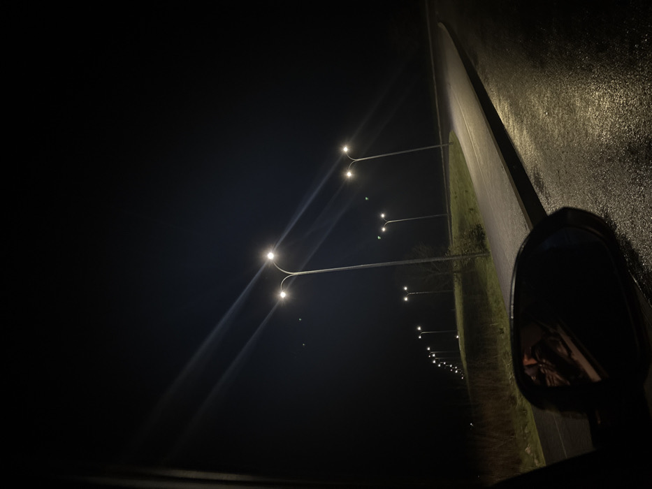 This image depicts a nighttime scene from the interior of a vehicle on a wet road in Mirandela, Portugal. A line of modern streetlights, each featuring two bright white light fixtures, extends into the dark distance along the left side of the road. The closest streetlight exhibits prominent lens flares due to its intensity. The asphalt road, visibly wet and reflective of the streetlights, curves gently to the right as it recedes. A faint white lane marking is discernible on the road surface. To the left of the road, a grassy embankment with sparse, dark vegetation runs parallel to the streetlights. The sky is completely dark, lacking any visible stars or other light sources beyond the artificial illumination. In the lower left foreground, a dark vehicle side-view mirror is prominent, reflecting indistinct shapes of the vehicle's interior and potentially an occupant. A dark vertical element on the far left suggests part of the vehicle's A-pillar or door frame. No people or other vehicles are clearly visible outside the immediate vicinity of the image capture. The environment appears dimly lit beyond the immediate radius of the streetlights, suggesting a rural or suburban roadway rather than a densely urban area.