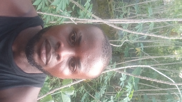 A medium shot captures a man with dark hair and a neatly trimmed beard, centered in the frame. He's wearing a black sleeveless shirt. Behind him, a dense backdrop of vegetation includes several stalks and leaves of cassava plants, creating a busy, natural setting. The lighting is soft and diffuse, highlighting the textures of the skin. The image is slightly rotated clockwise.