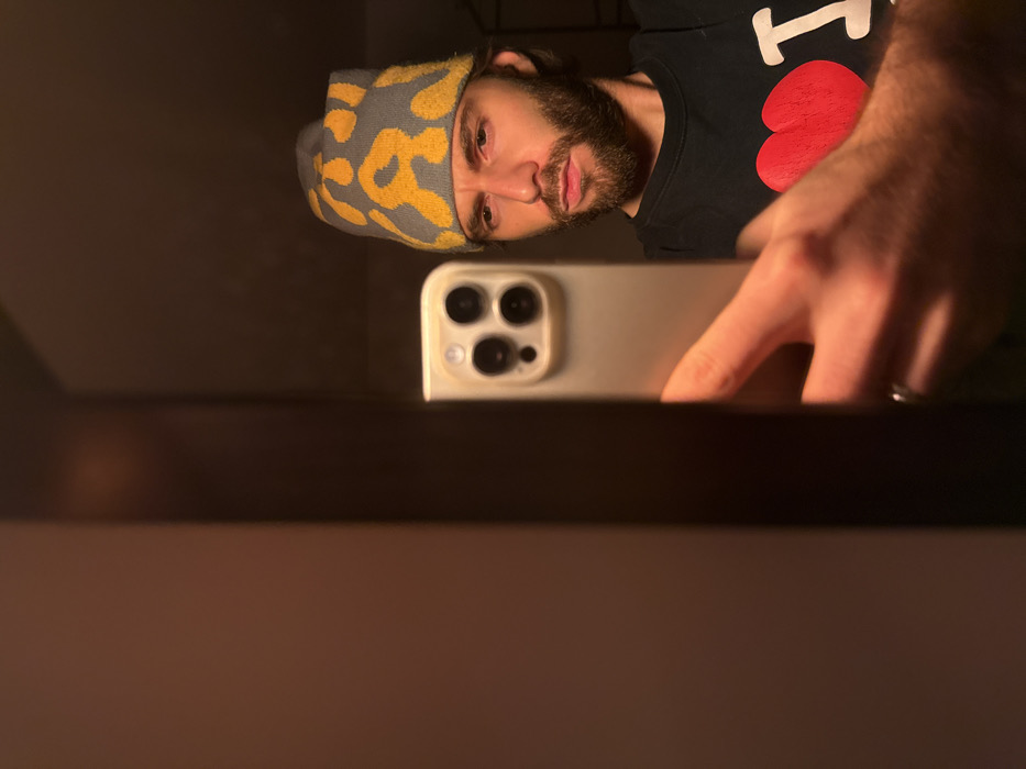 A man with a beard and a yellow and grey leopard-print beanie takes a mirror selfie. He holds a white smartphone with three lenses in his right hand. The man is wearing a black t-shirt with a large red heart design. The mirror reflects a dark room and part of a wooden frame. The image is angled with the man appearing upside down.