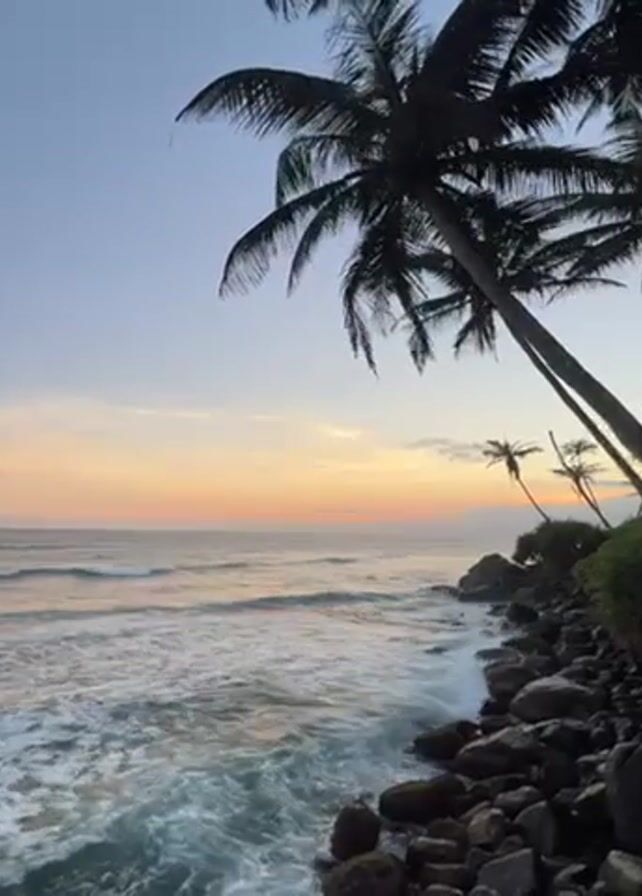 sunset scene at a rocky beach with palm trees. Waves are crashing against the rocks. The sky is colored in hues of orange, yellow, and blue. The palm trees are silhouetted against the sky. The video appears to be taken from a stationary position.