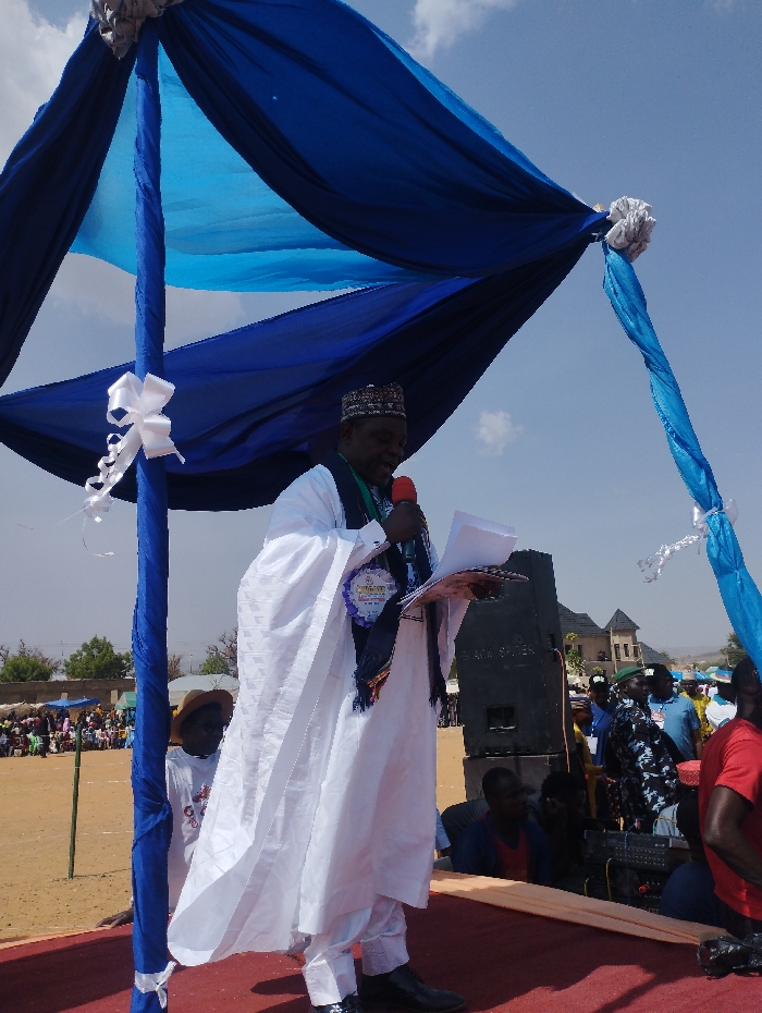 man speaking into a microphone while holding a paper in front of a crowd. He is wearing a white robe, a blue and white cap, and a blue sash with a purple badge. He is standing on a platform covered in red carpet, under a blue and white canopy. The speaker is positioned to the left of the frame, with a large black speaker stack on the right. Several people are visible in the background. The event is likely taking place in Chum, Nigeria, as the coordinates provided point to a location near the town of Chum. The setting is a large open space with brown sandy ground. The sky is clear with a few wispy clouds. There is a faint suggestion of trees in the distance.