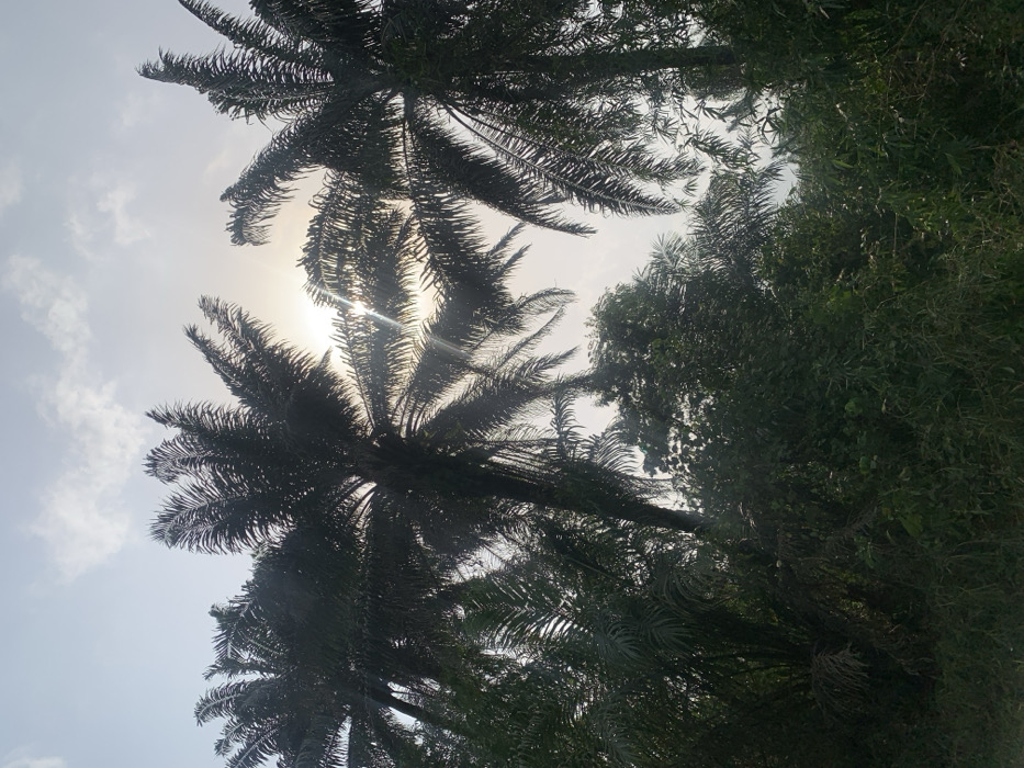 The scene depicts a natural outdoor environment in Ikot Obio Ata, Nigeria, characterized by dense tropical vegetation under a bright sky