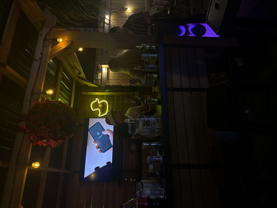 A festive scene shows a group of people gathered at an outdoor bar. A TV displays an image of a phone with a loading symbol. Decorations include a Christmas hat, a glowing Jeep sign, string lights, and a large floral arrangement. The bar is stocked with bottles and cans. The image is taken at night, with some areas darkly lit.