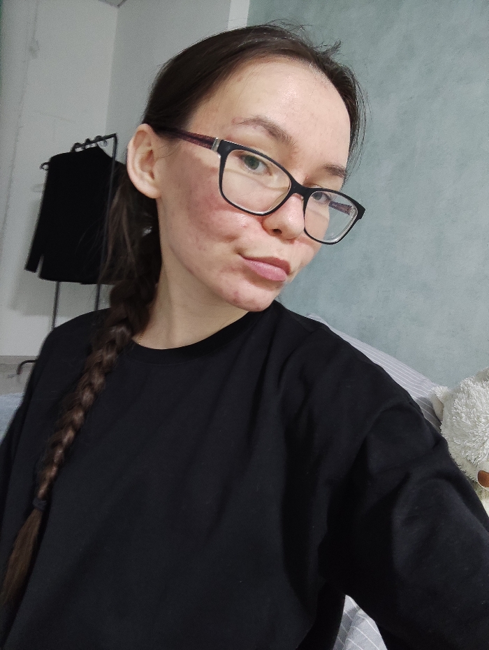 A female individual with dark brown hair, styled in a visible braid over her left shoulder, poses for a photograph. She wears black-framed eyeglasses with reddish-brown temple accents and a plain black long-sleeved shirt. Her face shows widespread redness and blemishes, particularly across her cheeks and forehead. She gazes directly forward with a neutral expression. To her left, a black garment hangs on a black metal clothing rack against a light-colored wall. To her right, a light blue-green textured wall is visible. In the lower right corner, a white, fluffy object, consistent with a stuffed animal, rests on a striped fabric of light gray and white. The scene is indoors. The specific location within Izhevsk, Russia, cannot be determined from the visual information.