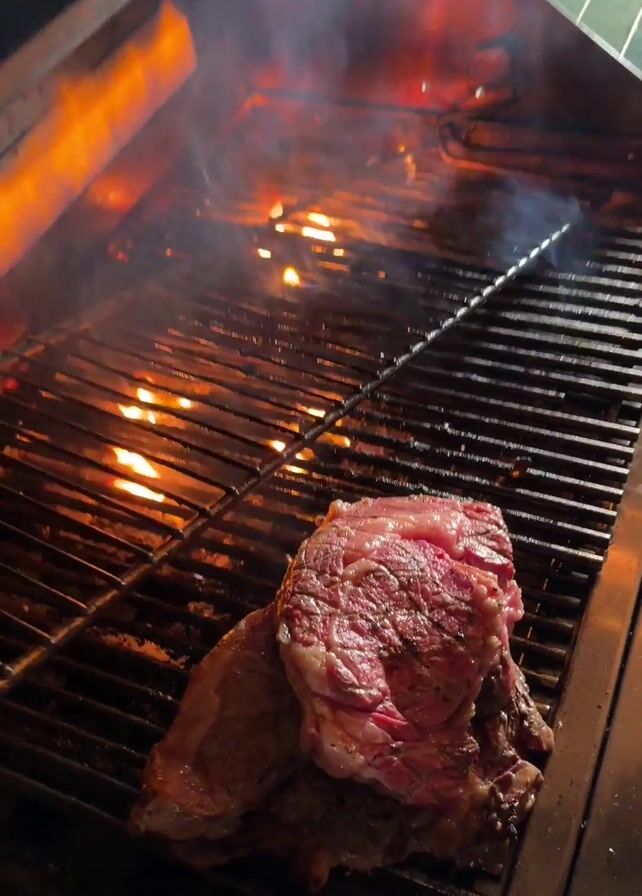 piece of raw red meat on a stainless steel grill. The grill is very hot, with flames visible underneath the grates. Tongs are used to manipulate the meat on the grill. The grill has a hood that is open, revealing the flames and grill surface. Smoke is rising from the meat as it cooks. The environment is dimly lit, suggesting it may be nighttime or an indoor setting.