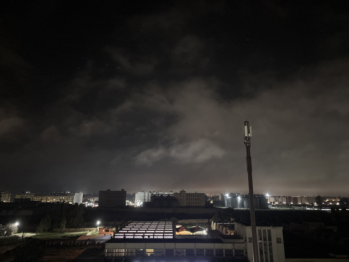 This image depicts a nighttime urban landscape located in Meknes, Morocco. The scene is dominated by a heavily clouded sky, with dark, layered clouds covering the majority of the upper frame; faint stars are barely discernible in the upper left quadrant. A tall, slender telecommunications tower occupies the right side of the foreground, featuring multiple segments and antennae at its illuminated apex. Below, the roofs of several industrial or commercial buildings are visible, characterized by a light-colored facade on the right and a dark, possibly corrugated, roof structure with illuminated internal spaces on the left. The midground shows dark, undeveloped or partially developed land with sparse vegetation and several low-level artificial lights. The background presents a dense urban sprawl, with numerous multi-story residential and commercial buildings illuminated by interior and exterior lights, creating a sprawling cityscape under the cloudy night sky. No individuals, vehicles, or specific activities are observable.