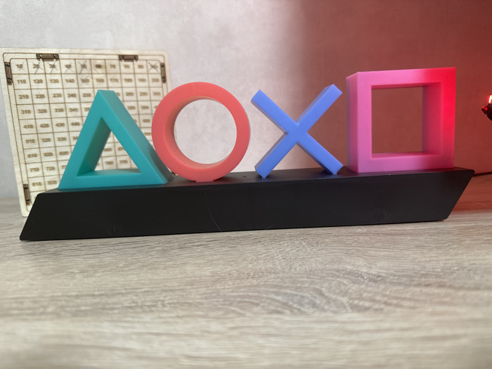 A multicolored plastic lamp resembling the PlayStation controller buttons sits on a light wooden surface. From left to right, the shapes are a turquoise triangle, a red circle, a blue cross, and a pink square. They rest on a black base. Behind the lamp is a light-colored grid with numerical inscriptions. A red light source is visible near the right edge. The background consists of a light gray wall.