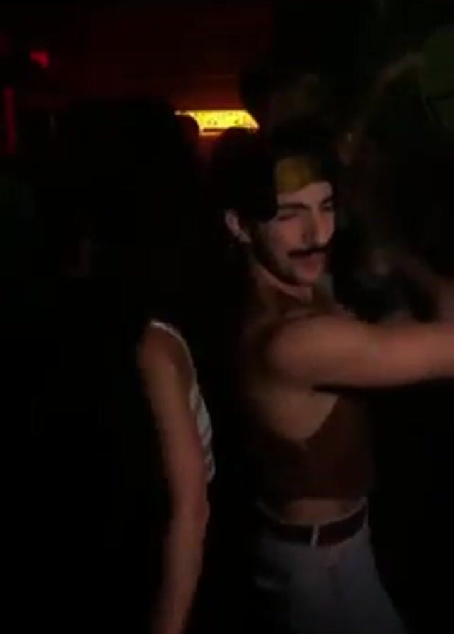 dance floor with multiple people, including a man with a moustache wearing a brown top and jeans, who is dancing back to back with a woman in a white top