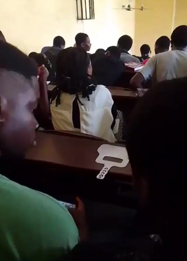 group of people in what appears to be a classroom or lecture hall. The camera is positioned behind the students, looking forward towards the front of the room. Most of the students are seated at desks, with books and papers in front of them. Some of them seem to be paying attention, while others look distracted. The room is lit with overhead fluorescent lighting. There are windows with bars on them visible in the background. The walls are painted a pale yellow color. The scene seems to be a typical classroom setting.