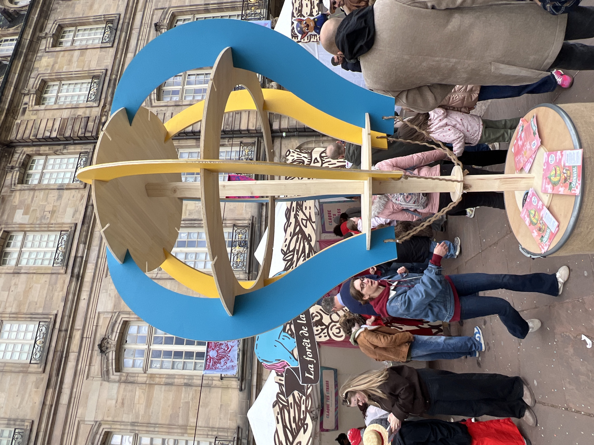 The image depicts an outdoor scene in Strasbourg, France, featuring a wooden art installation with blue and yellow accents, likely part of a festival or event