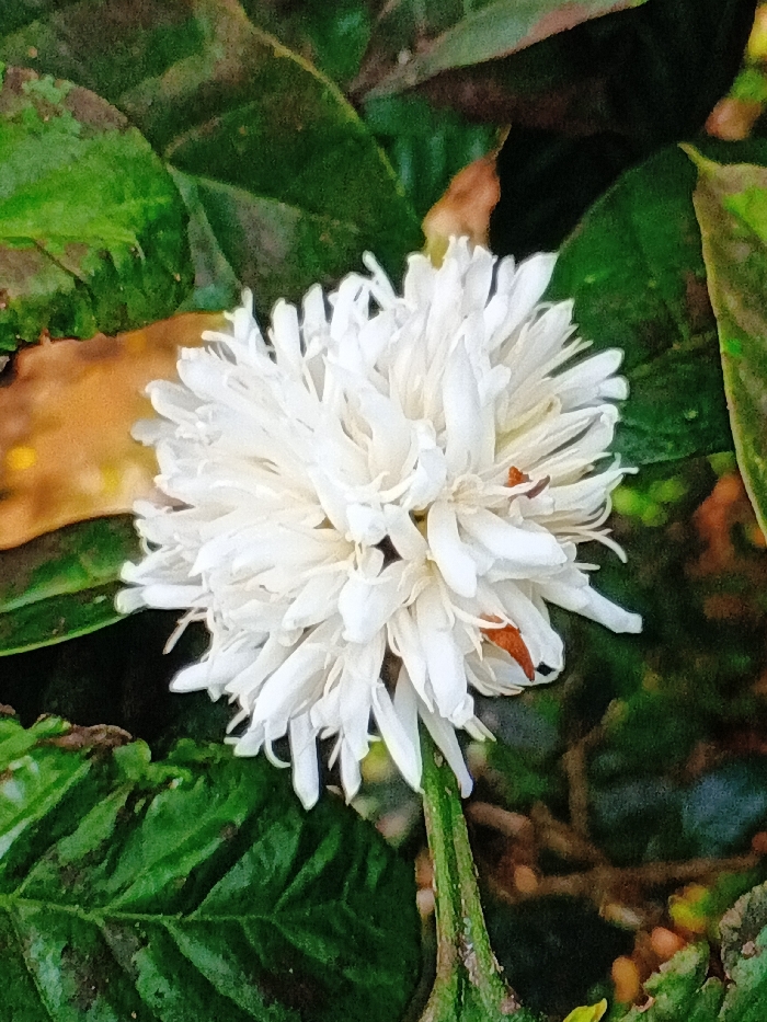 A close-up, macro-level image displays a single, radially symmetrical flower with dense, elongated white petals. The flower presents a clustered appearance, with several inner petals exhibiting subtle orange-brown coloration. It emerges from a sturdy green stem, positioned amidst a backdrop of dark green leaves, some showing minor brown discoloration and textured surfaces. A distinct segment of a larger, yellowish-orange leaf or organic material is visible in the upper left quadrant of the frame. The scene is devoid of human figures, manufactured objects, or discernible interactions beyond the natural plant structure. This botanical subject is located in Taungpi, Myanmar (Burma).