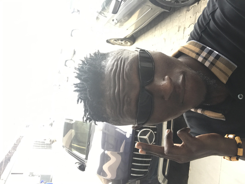 The scene is an outdoor setting in Ikeja, Nigeria, likely a vehicle lot or parking area. A male individual with dark skin, short dark dreadlocks, and visible forehead wrinkles is depicted in a selfie-style photograph. He wears black wrap-around sunglasses and a black polo shirt featuring a beige, black, and white plaid collar. An orange-brown beaded bracelet adorns his left wrist. His left hand is raised, with the index and middle fingers extended vertically and the thumb, ring, and pinky fingers curled. Behind the individual, a dark-colored Mercedes-Benz SUV is partially visible to the left, its grille and star logo prominent. A second, darker-colored sedan is partially visible to the right. The ground is paved with light-colored interlocking blocks. The distant background is heavily overexposed by bright natural light.