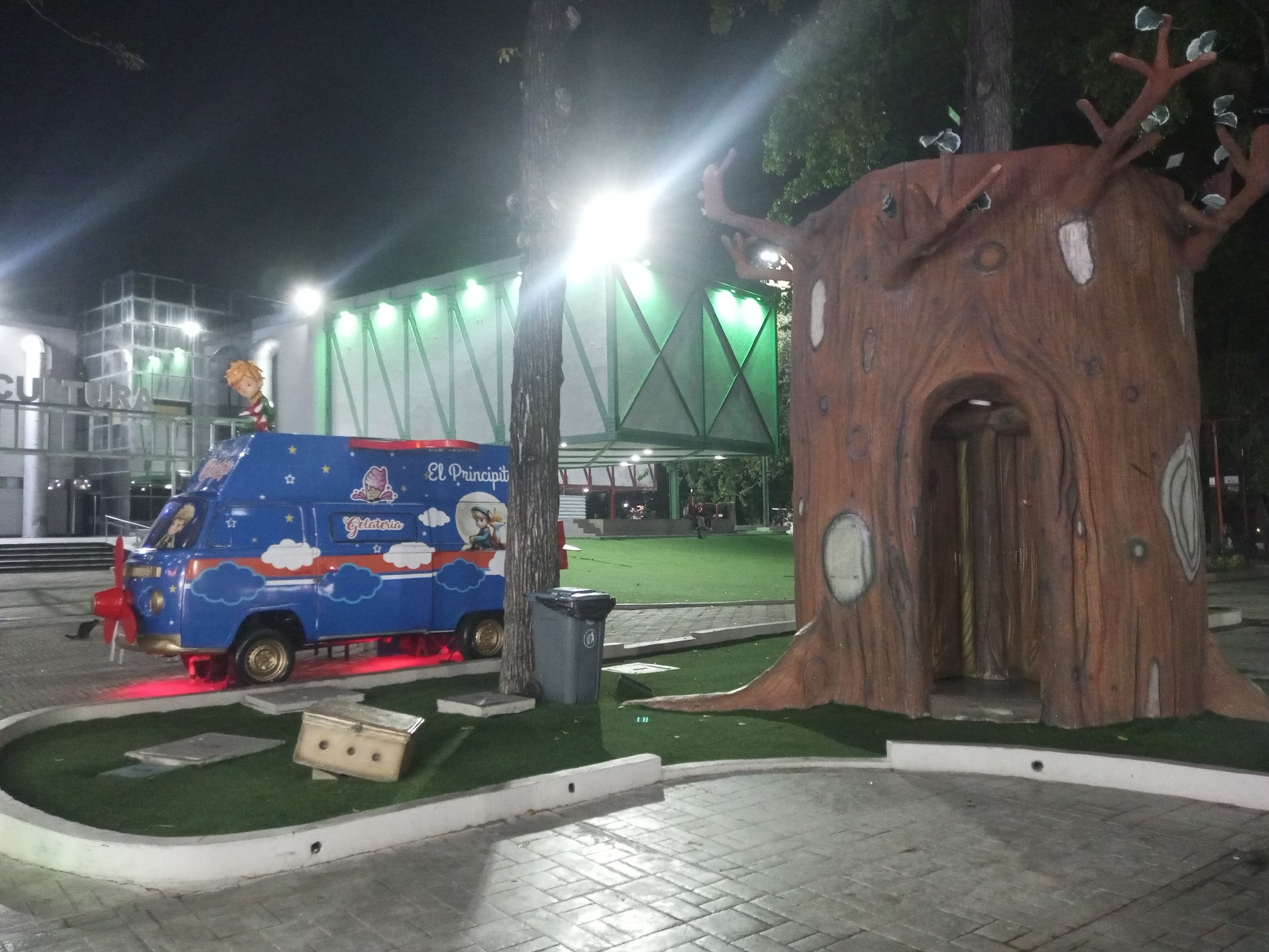 night scene in Valencia, Venezuela. A blue ice cream truck labeled "El Principito" and "Gelateria" is parked next to a large, faux tree structure with a doorway. The truck has a figure of a small boy on top and is adorned with cartoonish cloud designs. Red lights illuminate the underside of the truck. A trash can stands near the tree. In the background, a modern building with the word "Cultura" visible is situated next to an open-air structure with green lights. People are present in the background. A decorative chest sits on the ground near the truck. The area is paved with stone and contains patches of artificial grass surrounded by concrete borders. A tree is standing between the truck and the artificial tree structure.