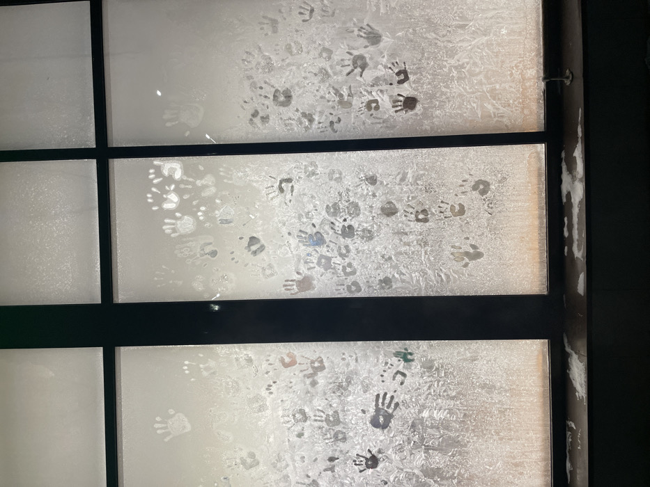 A window pane, divided into multiple sections by a black frame, shows a frosted surface. Handprints of varying sizes and clarity are visible on the frosted glass. The frosting creates an uneven, textured appearance, making some prints more defined than others. The overall scene evokes a sense of playfulness or artistic expression through the frozen medium.