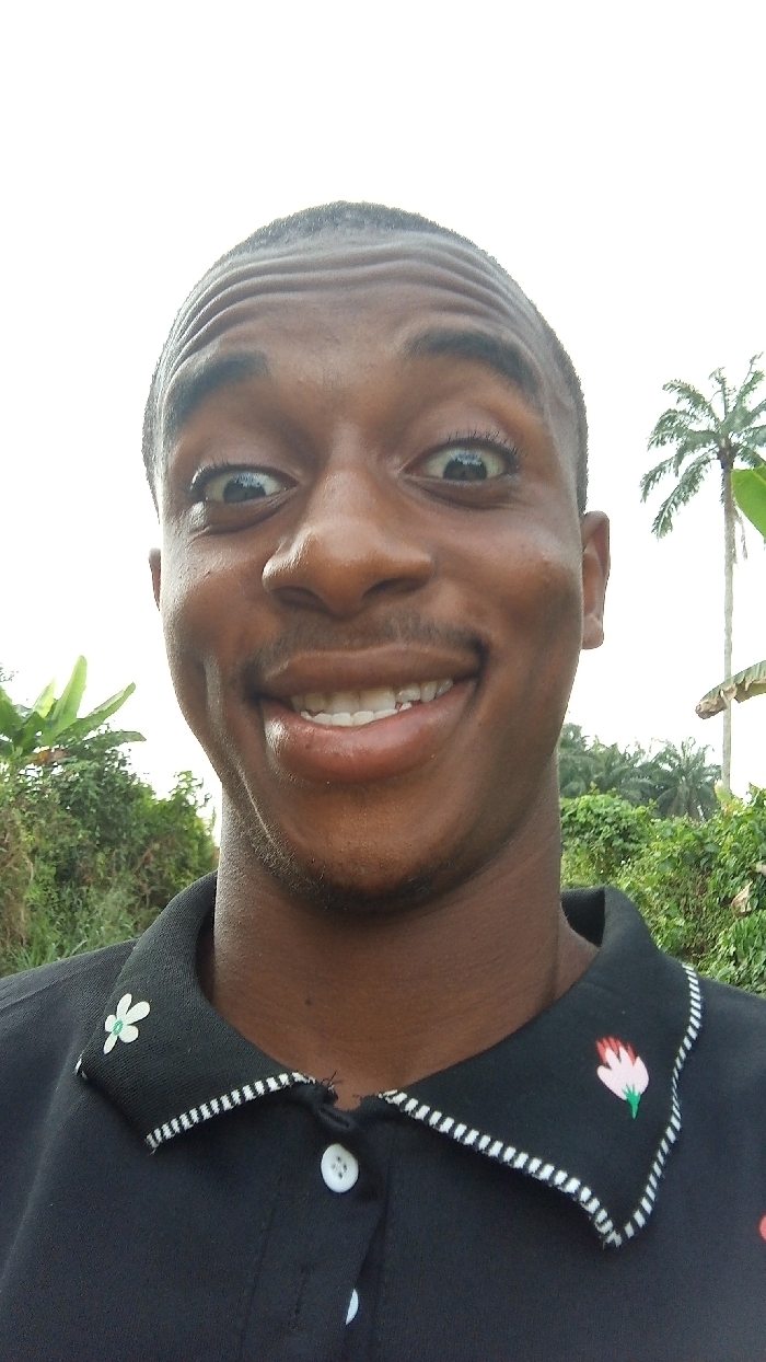 A close-up photograph depicts a dark-skinned male individual from the upper chest upward, positioned outdoors in Agburu Uke, Nigeria