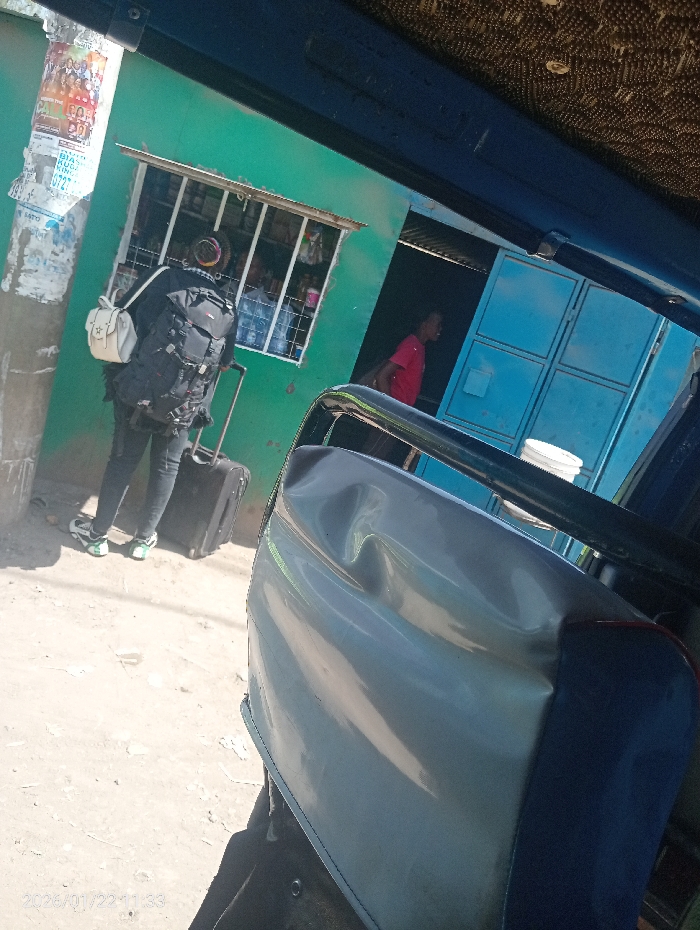 The image depicts an outdoor scene in Nakuru, Kenya, observed from within a vehicle. In the immediate foreground, a grey vinyl seat with a dark blue base is visible, along with a textured brown fabric ceiling panel of the vehicle. Outside the vehicle, a teal-painted building is central, functioning as a shop or kiosk. It features a barred window displaying bottled items, likely beverages or water. To the right of the window, an open doorway reveals a dark interior, with a light blue metal door partially visible beyond it. One individual, oriented with their back partially to the camera, stands on unpaved ground in front of the shop window. This person wears a dark top, black pants, and white and green athletic shoes. They are equipped with a large black backpack, a smaller white shoulder bag, and a black rolling suitcase positioned on the ground near their feet. Their head shows a dark, possibly braided or wrapped, hairstyle. A second individual, wearing a red short-sleeved shirt, stands inside the open doorway of the teal building, facing towards the right. To the left of the building, a utility pole is heavily covered with multiple layered paper advertisements. The ground surface is unpaved and appears dusty. A digital timestamp "2026/01/22 11:33" is visible in the lower-left corner.
