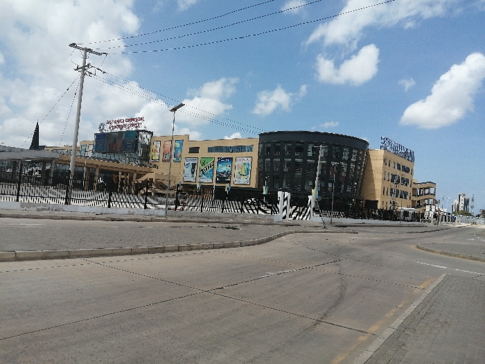 A modern commercial complex dominates the scene, boasting a mix of angular and curved architectural designs