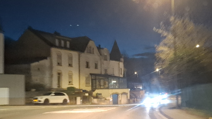 The image captures a nighttime street scene in Sanem, Luxembourg, viewed from a slightly elevated or moving perspective
