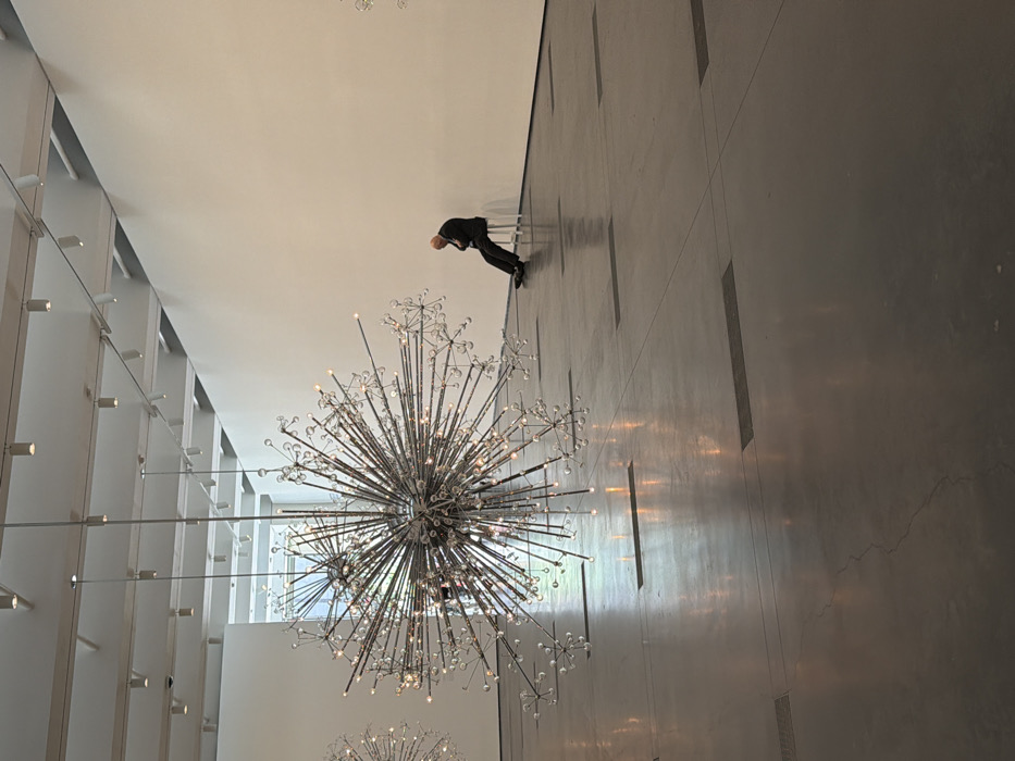 The image displays an interior view of a contemporary art gallery within the Los Angeles County Museum of Art (LACMA) in Los Angeles, California, United States of America. A large, spherical "starburst" sculpture, consistent with Josiah McElheny's works, is suspended from the ceiling in the foreground. This sculpture consists of numerous metal rods radiating from a central point, each tipped with a small, illuminated glass orb or crystal. Similar, partially obscured sculptures are visible in the surrounding space. The floor is smooth, dark grey concrete, exhibiting reflections from the overhead lighting and the art installation. The walls are plain white, leading up to a high ceiling with exposed white beams and multiple recessed track lights. In the midground, against the right-hand white wall, a bald male figure, dressed in a dark suit, is seated on a small, white, backless stool. His head is bowed, and his posture suggests contemplation or rest. He is the sole individual visible, positioned distantly from the primary art installation.