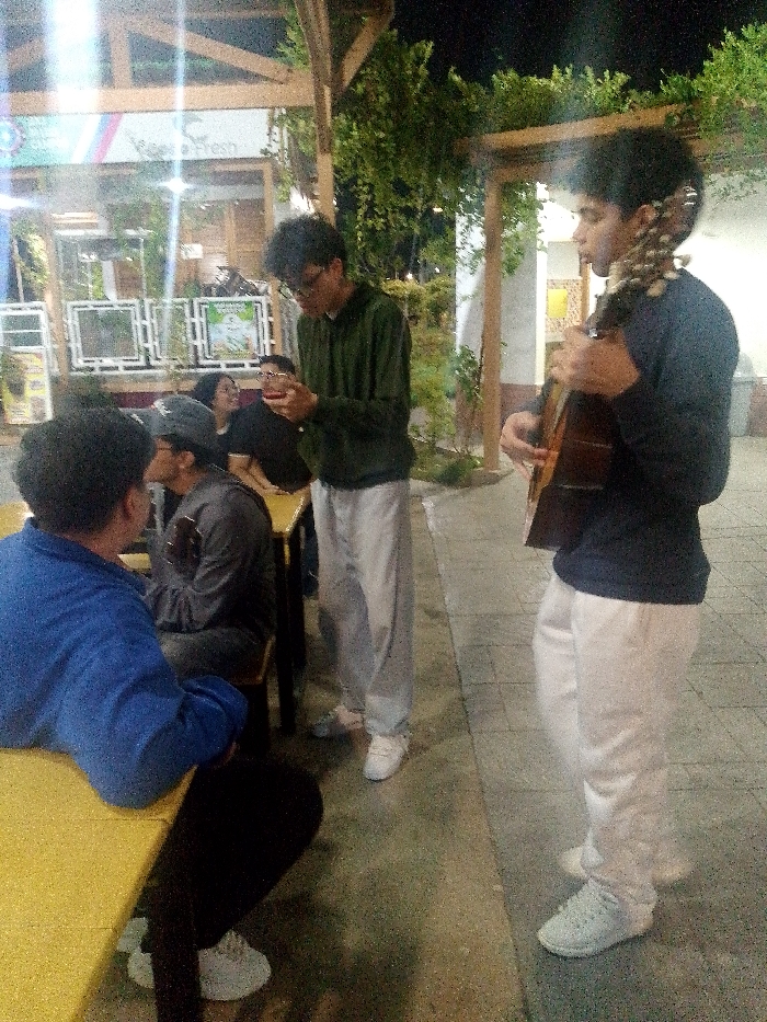 Outside at night, several people gather under a wooden pergola overgrown with vines. One man in a blue shirt sits at a yellow table, while others stand nearby. Another man in a green hoodie looks at his phone. A third man with an instrument, possibly a guitar, appears to be playing for the group, who are seemingly enjoying themselves.