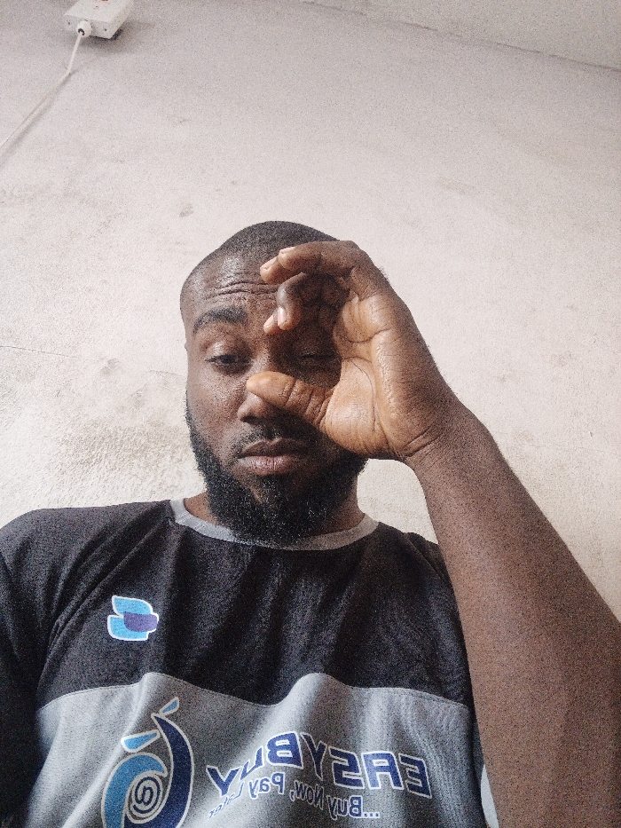 An individual is depicted indoors, likely in Fagge A, Nigeria, against a plain light-colored wall. The subject is a male of African descent, with short dark hair and a full beard. He is wearing a two-tone t-shirt, dark grey on the upper section and light grey on the lower, featuring a blue and dark blue logo on the left chest and the inverted text "EASYBUY Buy Now! Pay Later..." on the lower half. His right hand is raised to his face, with the thumb and index finger forming a circle over his right eye, while the remaining fingers are extended. His left eye is visible, and he maintains a neutral expression. In the upper left background, a white rectangular electrical fixture is mounted on the wall or ceiling, with a white wire extending from it.