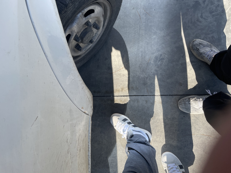 The image provides an overhead, high-angle view of a concrete surface and a section of a white vehicle under clear daylight conditions in Tbilisi, Georgia. The upper portion of the frame depicts the lower side panel and rear fender of a white vehicle, consistent with a car or a small van. The vehicle's bodywork is visibly dirty, exhibiting numerous smudges, streaks, and minor linear abrasions. A black tire with a silver-colored five-lug steel wheel is partially visible beneath the fender on the right side. Small rust spots are present along the lower edge of the fender and around the wheel arch. Two individuals are standing on the concrete surface. On the left, a person is wearing dark grey sweatpants and white Adidas sneakers with black stripes, positioned with their left foot extended towards the vehicle. In the lower center and right, another individual is wearing black trousers and light-colored, possibly off-white or grey, textured sneakers. Their feet are oriented towards the top of the frame. A third person's presence is indicated by a set of distinct shadows cast on the concrete to the right. The ground is composed of a grey concrete slab with a visible vertical seam or expansion joint running through the middle foreground. Strong illumination from an unseen light source, presumably the sun, creates sharp, elongated shadows of the individuals and the vehicle, extending across the concrete. There are no explicit interactions between the individuals or with the vehicle.