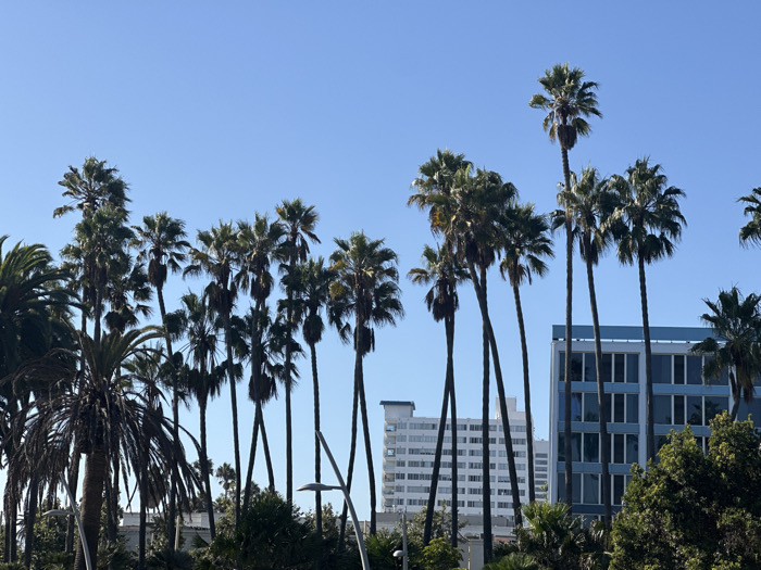 The image displays an urban scene in Santa Monica, United States, under a clear, cloudless blue sky. A dense cluster of tall palm trees with dark green fronds and slender trunks dominates the midground and foreground, reaching into the upper portion of the frame. Some shorter palm trees and other green foliage form a lower layer. In the background, two multi-story buildings are visible: one on the right features a light blue facade with white horizontal banding and multiple dark-paned windows across at least five floors, partially obscured by palm trees. To its left, a lighter-colored building with numerous windows is visible further in the background. Two curved, light-colored streetlights or decorative poles are partially visible emerging from the foliage in the lower-center. No individuals, actions, or interactions are depicted.