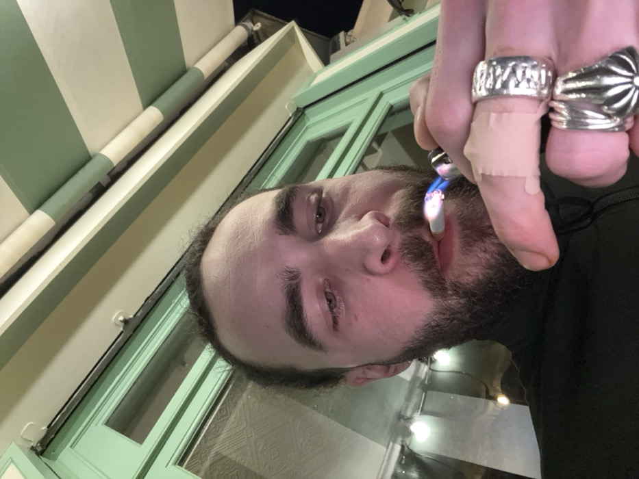 A man with a beard is seen from a low angle, holding a lit cigarette to his mouth with his fingers. His fingers are adorned with large rings. One finger has a bandage. The background is an outdoor scene with a green and white striped awning and a green window frame. The lighting suggests it is night.