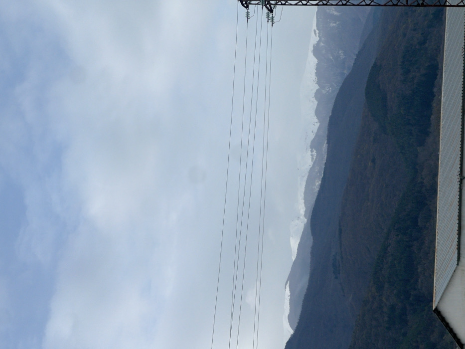 The image displays a mountainous landscape under an overcast sky, observed from the city of Parvomai, Bulgaria. In the foreground, the upper portion of a light-colored building's roof with visible corrugated material is present in the lower left quadrant. Above this, successive layers of mountains stretch horizontally across the frame. The closest mountains are dark, covered in what appears to be dense forest. Further back, higher mountain ranges are visible with snow-capped peaks, appearing white against the greyish sky. Approximately five horizontal power lines traverse the middle ground of the image. On the far right, a section of a metal lattice power pylon, including insulators, extends vertically from the bottom right corner. The sky occupies the upper half of the image, characterized by a light blue-grey, diffused cloud cover. No people or animals are visible.