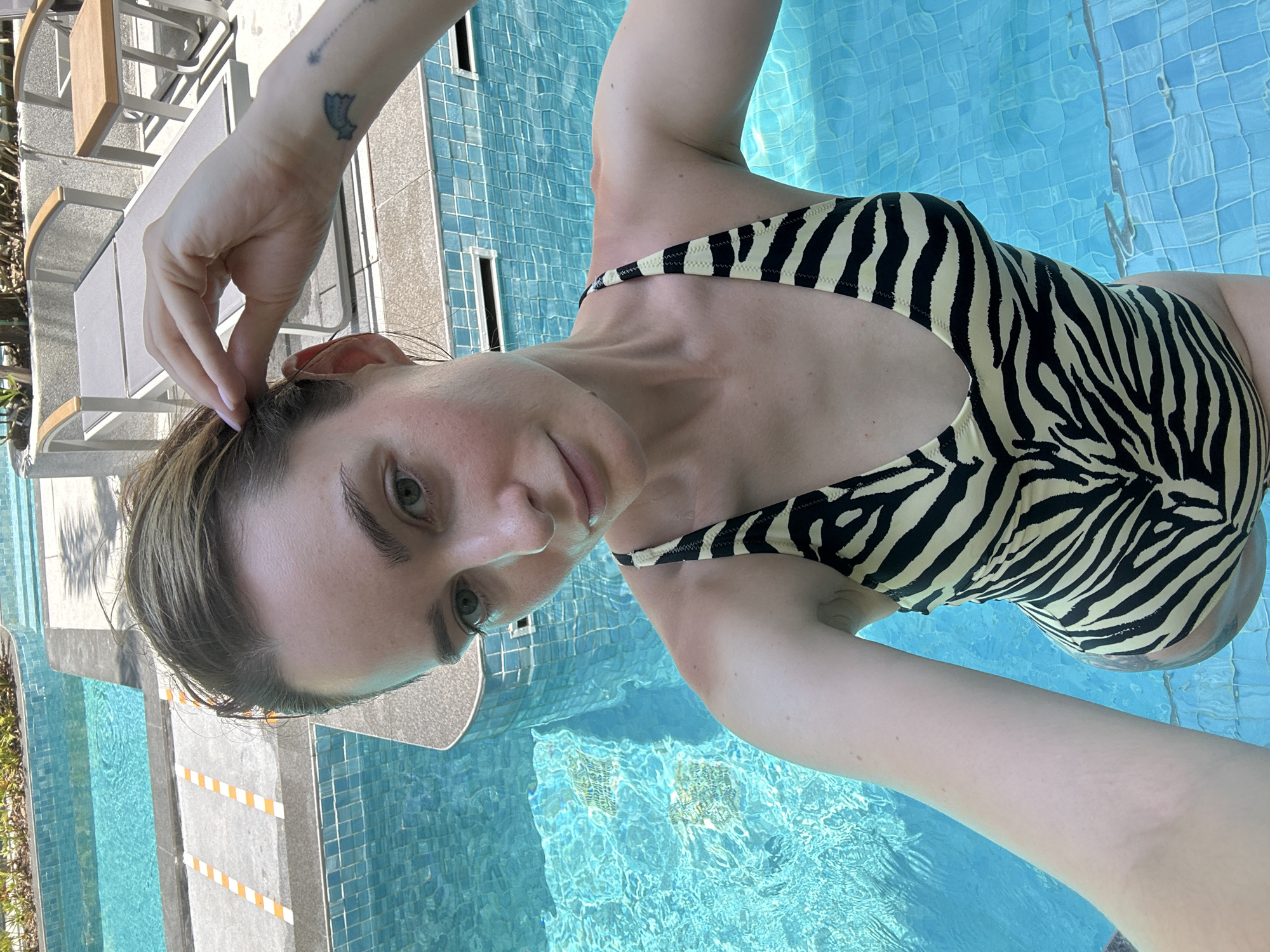 A woman with fair skin and light-colored hair poses for a selfie in a pool with light blue tile. She is wearing a black and beige zebra-striped swimsuit. The pool is located in Choeng Thale, Thailand.