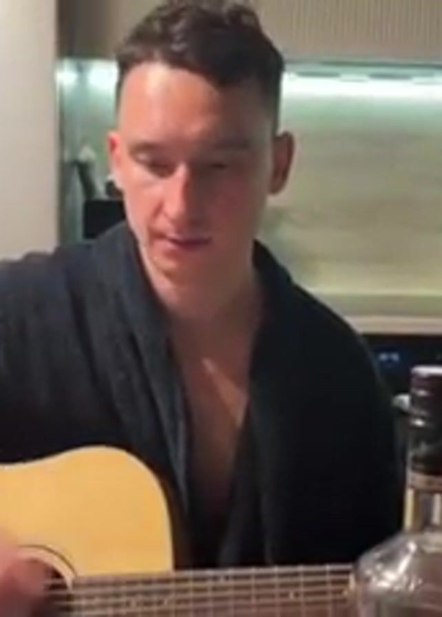 A man in a dark blue robe sits in a kitchen and plays an acoustic guitar. The kitchen has light wooden cabinets and light-colored countertops. A bottle of liquor stands on the counter near the guitar. Another person's arm comes into the frame.