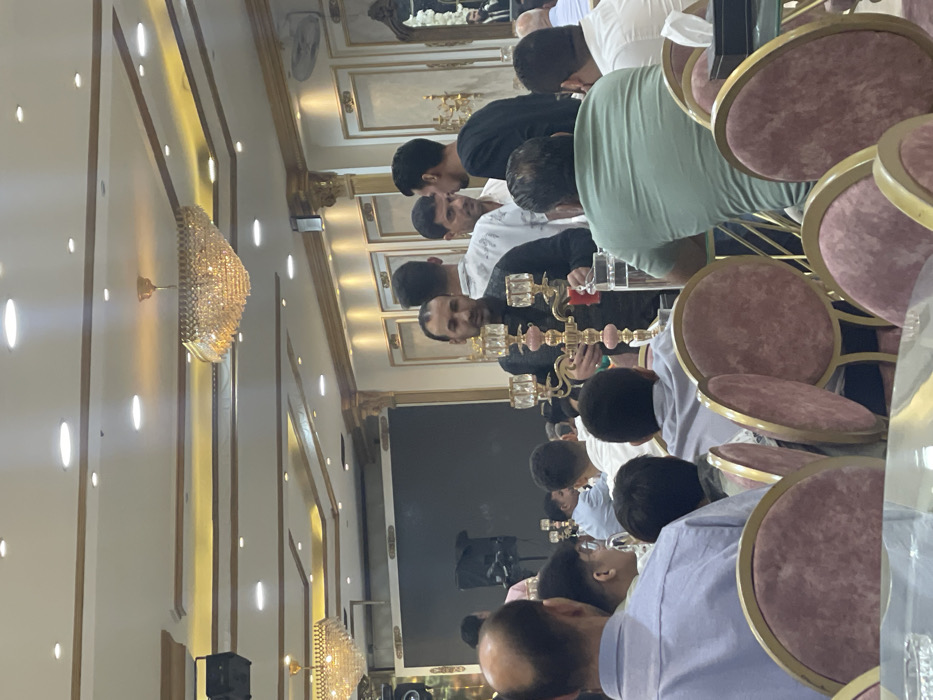 This image depicts an indoor social gathering within an event hall in Babella, Syria