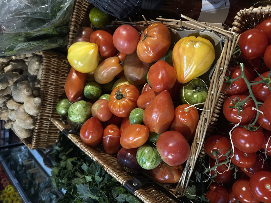 The image displays an indoor retail setting featuring a fresh produce display. The central focus is a large wicker basket filled with various ripe tomatoes. These include red, orange, yellow, dark reddish-brown, and green tomatoes with pale green stripes, exhibiting diverse shapes such as round, ribbed, and pear-shaped varieties. Directly below this basket, another wicker container holds red tomatoes still on the vine. In the upper background, a separate wicker basket is densely packed with numerous large ginger roots. Green leafy vegetables are visible along the left edge of the frame and partially bagged in the upper right background. The lower right portion of the image shows dark-colored bottles on a shelf. The scene is illuminated by artificial lighting. No individuals are visible. The specific location within London, United Kingdom, cannot be definitively identified from the visual evidence; however, the type and presentation of the produce indicate a specialty grocer or market stall.