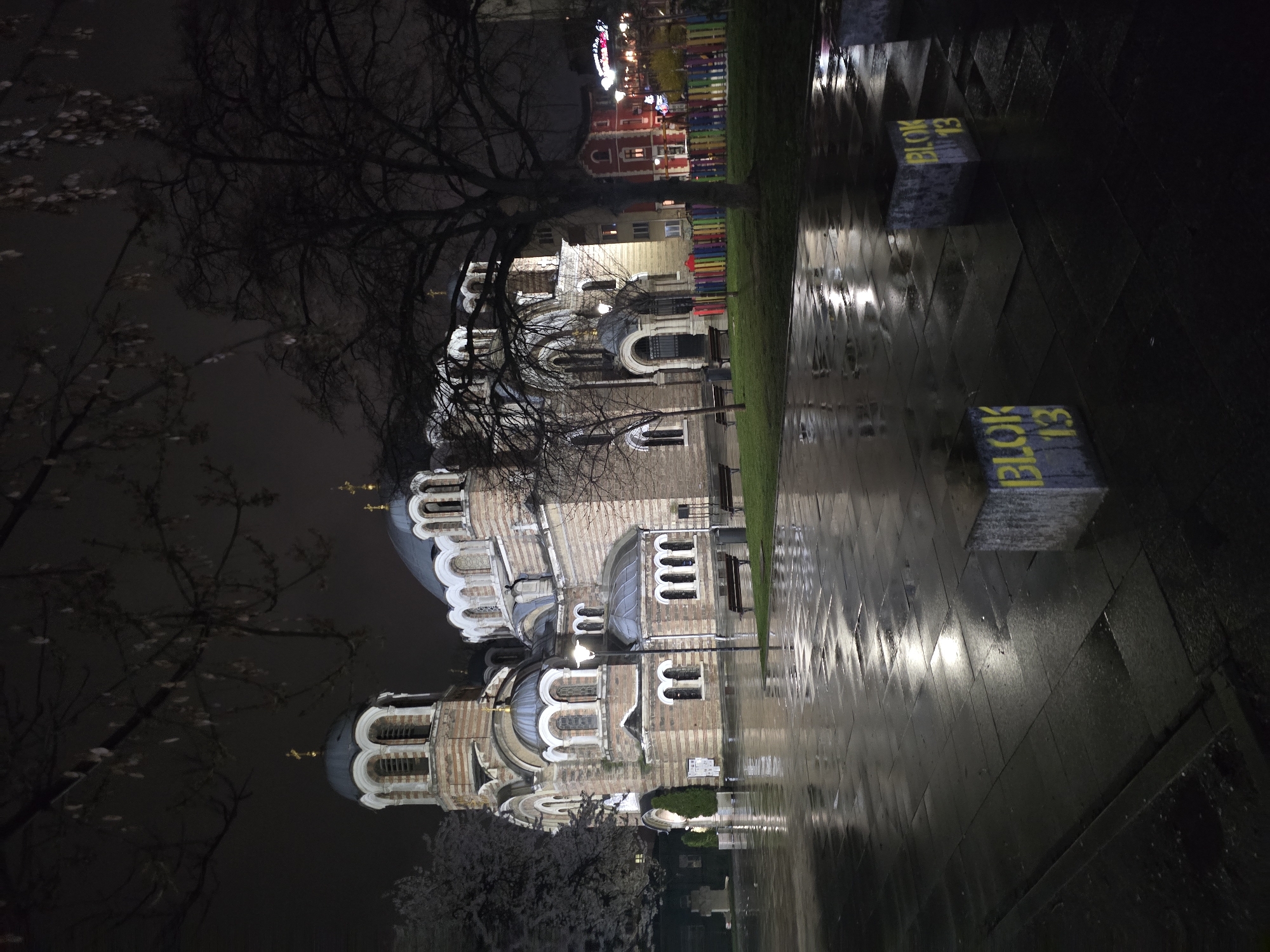 - "St. Alexander Nevsky Cathedral in Sofia, Bulgaria at night. The cathedral is brightly illuminated and reflected in a wet pavement. Bare trees frame the cathedral. A building and a park with colorful decor are in the background. Two concrete blocks with yellow "BLOK 13" graffiti are in the foreground. No people are visible." by FM-fH2Nq1, licensed under CC BY 4.0