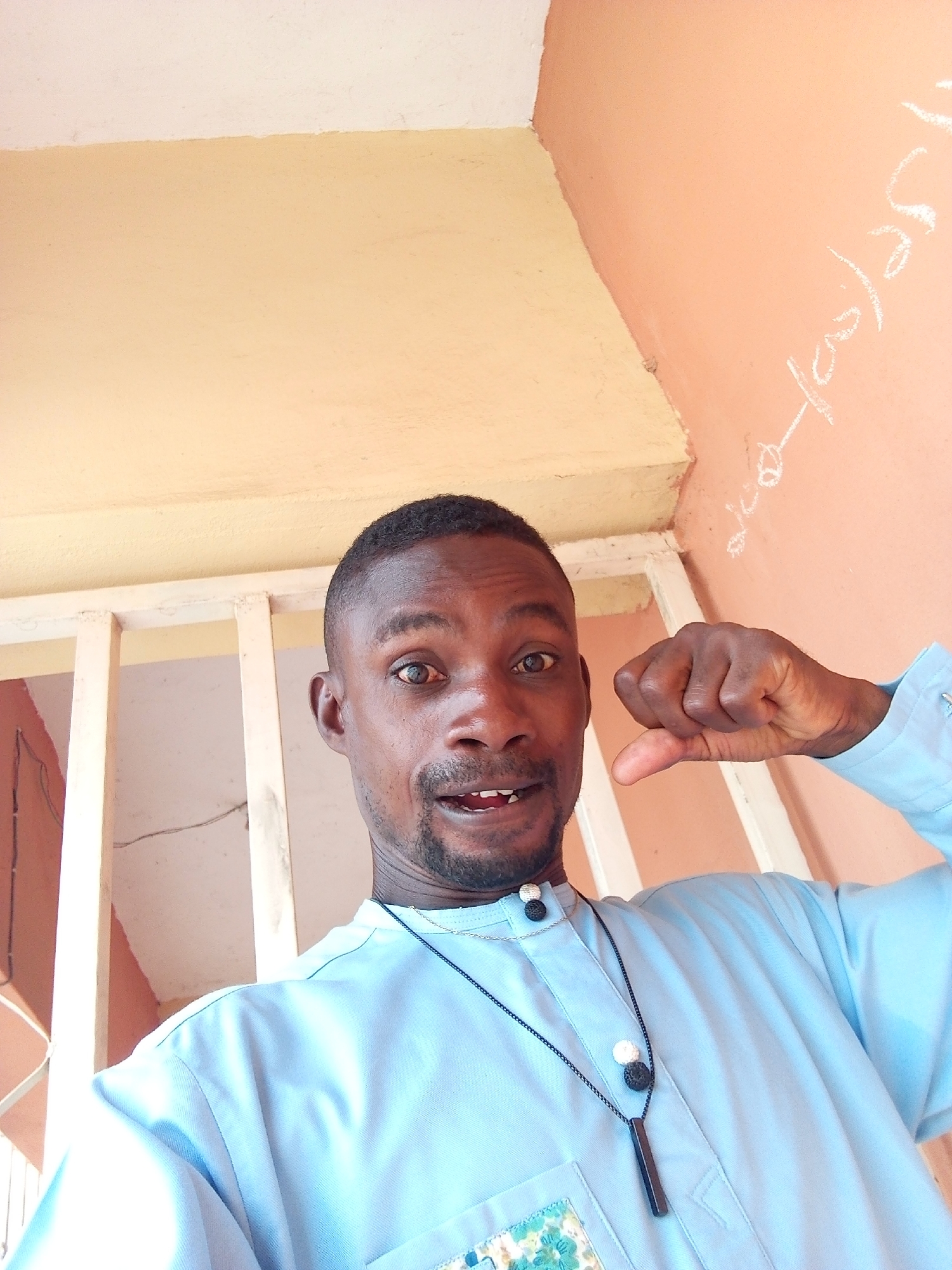 A man with dark skin, short black hair, and a stubbly beard is taking a selfie in what appears to be a building in Otokiti, Nigeria. He wears a light blue button-down shirt with a decorative, possibly crocheted, patch on the pocket and a necklace with a dark pendant. He is giving a thumbs-down gesture. The background consists of a peach-colored wall with chalk markings, a lighter yellow ceiling, and a white barred structure. The lighting appears to be from an overhead source.
