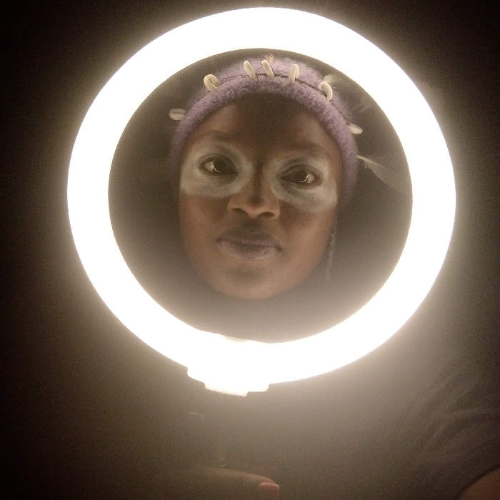 A woman with dark skin is framed by a bright ring light against a dark background. She wears a lavender knit cap adorned with what appear to be seashells. White streaks of face paint accentuate her eyes, and her lips are a muted plum color. The composition focuses tightly on her face, drawing attention to her gaze and distinctive makeup. Part of a hand can be seen holding the bottom of the ring light.