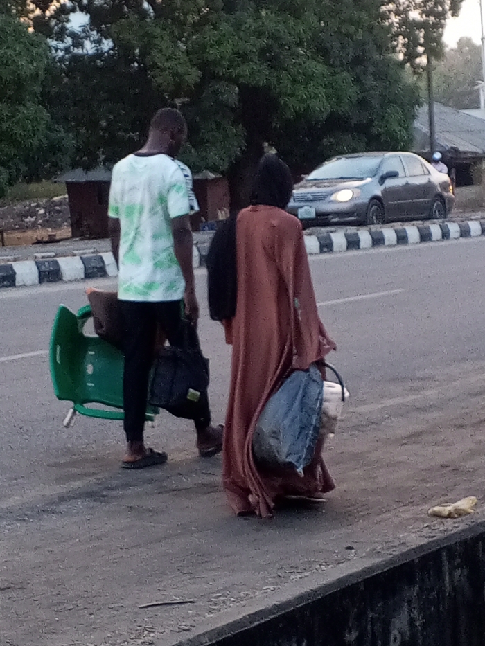 Two figures walk along a roadside. The person on the left carries a green plastic chair, a bag, and wears dark pants with a light-colored shirt. The individual on the right is dressed in a long, flowing orange garment, carries a bundle, and has a dark shawl or scarf over their head. A gray car is parked on the other side of the road, with trees in the background. The area appears to be an urban or suburban setting.