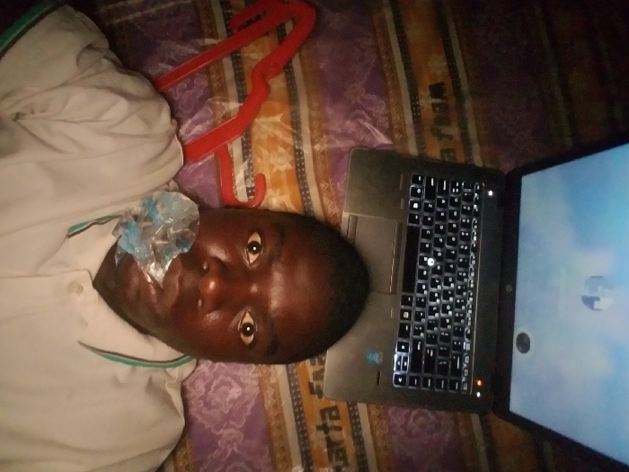 A person lies on a striped bedspread next to a laptop. The screen of the laptop is lit up with the HP logo. The person has a plastic bag held against their cheek. A red clothes hanger lies next to the person's head. The person is wearing a white collared shirt with green trim.