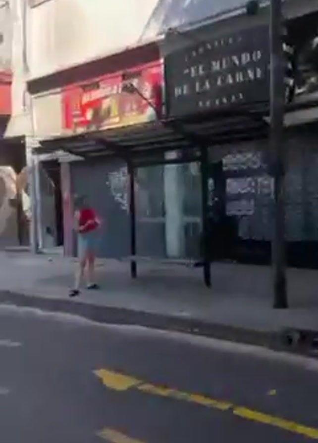 The video captures a street scene from a moving vehicle, likely a car or bus, driving along a city street during daytime. The view is primarily focused on the buildings and storefronts passing by. Buildings of varying architectural styles are visible, some displaying commercial signage such as "SUPERVILLE," "AVON," and "Area." Some of the storefronts have their security shutters down. Occasional glimpses of people walking on the sidewalks are caught, along with street furniture like trash cans and utility poles. The road is marked with yellow lines and a crosswalk is visible at one point. The weather appears sunny, with clear blue skies.