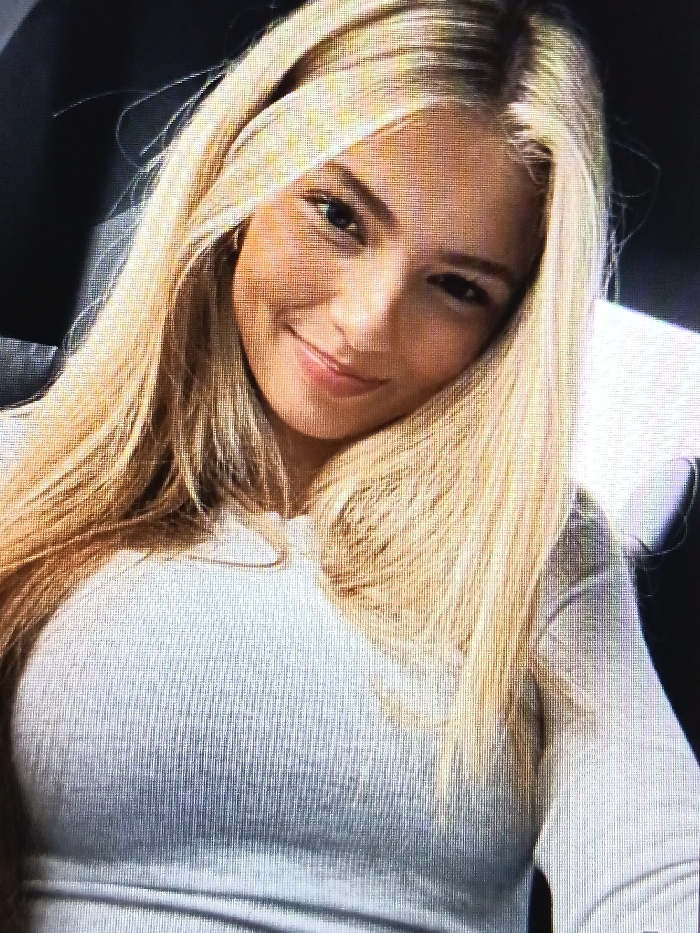 A close-up portrait depicts a female individual with long, wavy, blonde hair, styled with a slight side part. She has a fair complexion, dark eyes, and is looking directly at the camera with a slight smile, which causes a dimple to appear on her left cheek. Her head is tilted slightly to the right. She is wearing a light-colored, possibly white or light grey, ribbed long-sleeved top, visible from the upper chest to just below the shoulders. The background is dark, blurred, and out of focus, offering no specific environmental details. No specific geographical markers or contextual elements are present in the image to identify its location as Cherven Bryag, Bulgaria, or any other specific city. The image exhibits pixelation, consistent with a photograph of a digital display. No other individuals, objects, actions, or interactions are discernible within the frame.